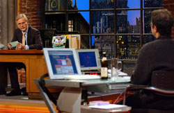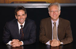Sat.1-Chef Martin Hoffmann und Harald Schmidt auf der Pressekonferenz in Berlin: Strahlend verkündeten sie die Fünftagewoche für die "Harald-Schmidt-Show". Foto: Sat.1/Andre Kowalski |